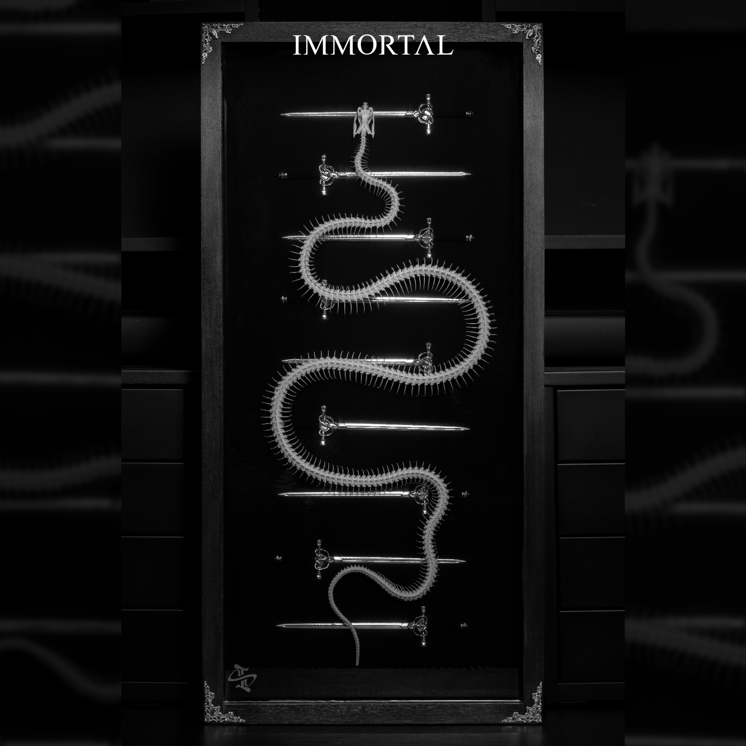Bộ xương thu được từ xác của rắn cạp nia (Bungarus candidus) bao phủ hoàn toàn bằng resin epoxy giúp tiêu bản lưu giữ được kết cấu và màu sắc mãi mãi, không gặp các vấn đề như xương rụng gãy hay va chạm như các tiêu bản xương nguyên bộ thông thường. Khung tranh được làm từ gỗ óc chó (walnut) và mặt lưng là gỗ đỏ Nam Phi đã qua xử lý kĩ càng tỉ mỉ bởi chính nhà xưởng Immortal.
